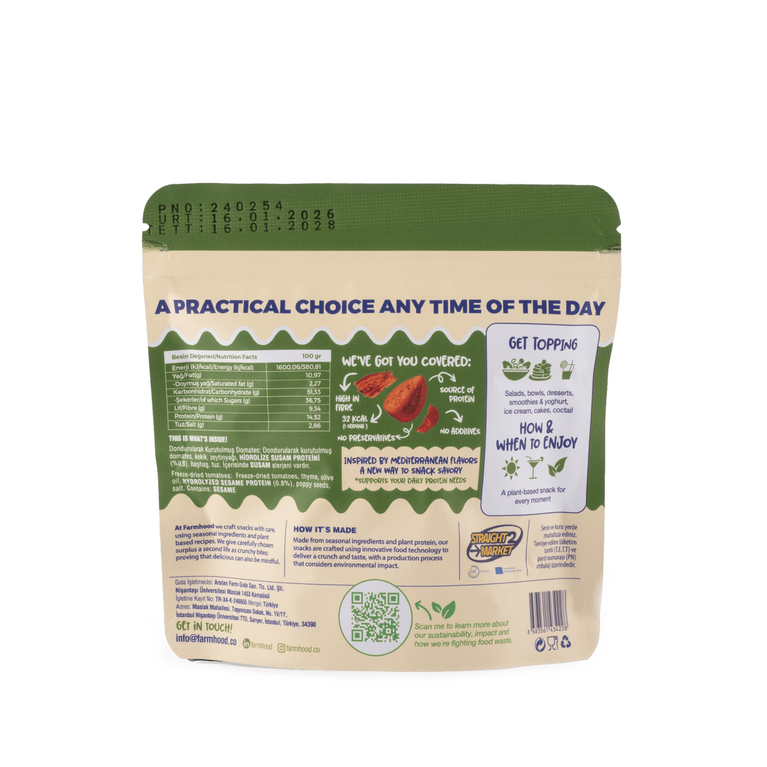 Yeni Farmhood Bitkisel Protein Destekli Domates Cipsi ile tanışın. Gerçek domateslerden üretilmiş, yüksek lif ve bitkisel protein içeren bu çıtır lezzet, gün boyu enerjinizi destekler. Sağlıklı ve lezzetli bir atıştırmalık arayanlar için mükemmel bir alternatif!